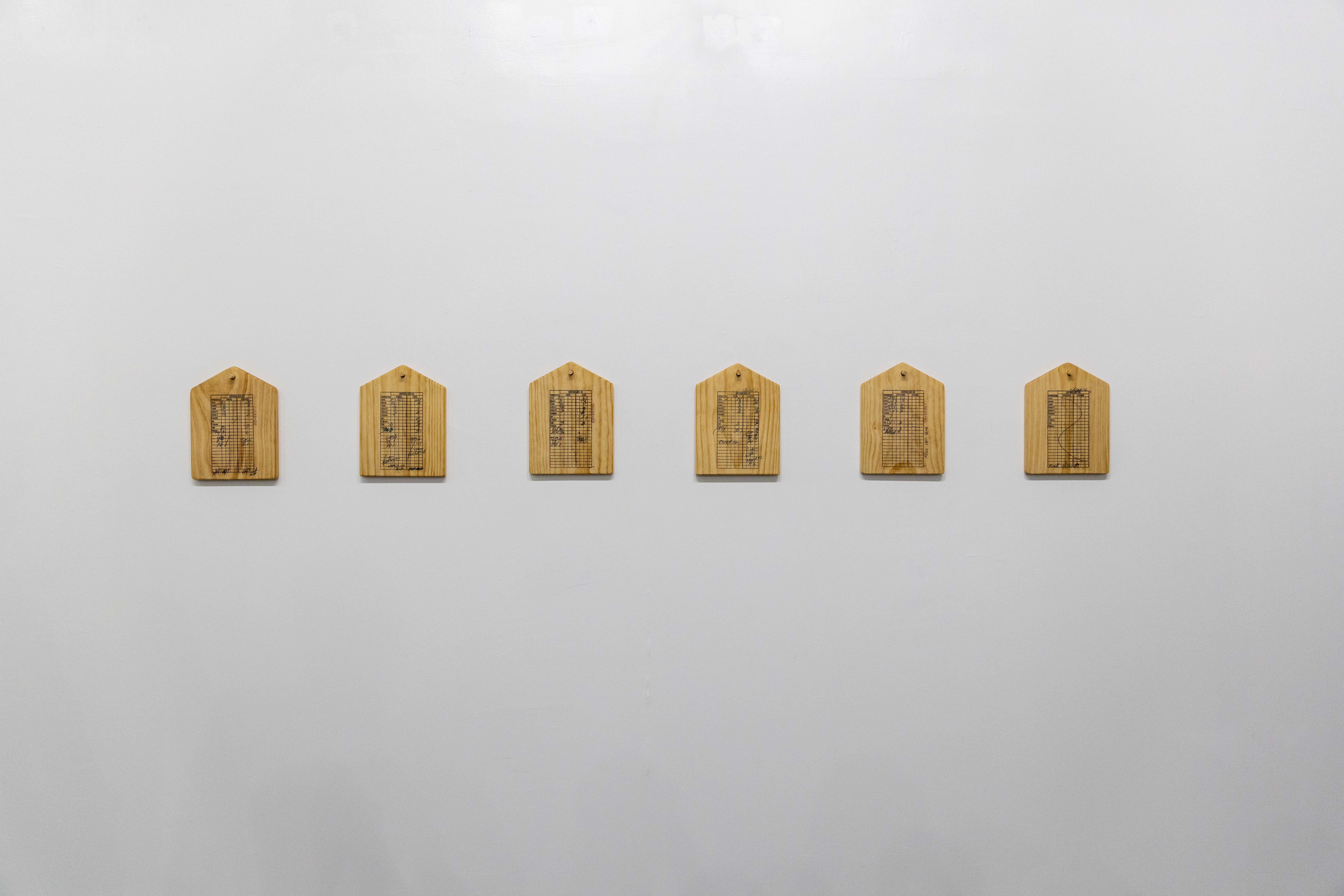 Donde Comen Dos, Comen Tres (Where Two Can Eat, Three Can Eat) is an artist calendar that portrays the oppressive scarcity of the rationed food distributed over the course of a year at a bodega (grocery store) in Cuba. Rationing is controlled by the Cuban government through the implementation of a Libreta de Abastecimiento ("Supplies Booklet"), which is assigned to every household. In this way, the system establishes the amounts of subsidized rations that each household is allowed to receive according to its number of members, along with the frequency at which supplies can be obtained. Voicing these daily struggles of Cuban families, the calendar is composed of six individual wooden cutting boards customized by the artist whose shapes recall the silhouette of a house. On each cutting board, an image transfer of a graphic chart is displayed showing the number of supplies given to a family of three over a two month period. These charts are extracted from an original Supplies Booklet (2021) belonging to one of the artist's friends who currently lives in Cuba.
